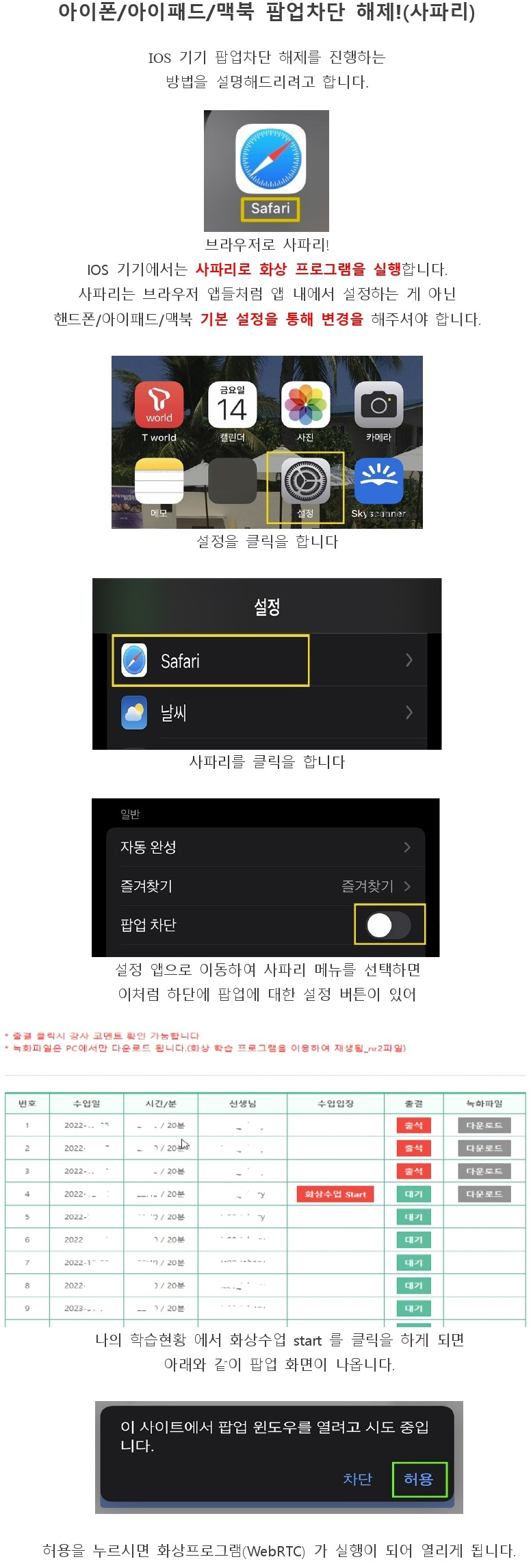 IOS 사용자는 Web화상 프로그램으로 변경을 해야 합니다.IOS 기기로 수업을 하실려면 질문방 이나 고객센터로 연락주세요~