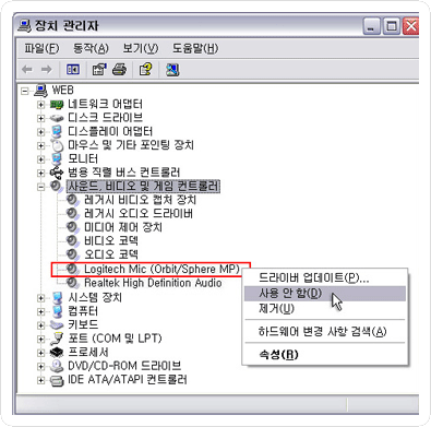 [USB오디오장치]항목(또는 해당 모델명) 오른쪽 클릭 하여 사용 안 함 선택 후 재 부팅 하세요